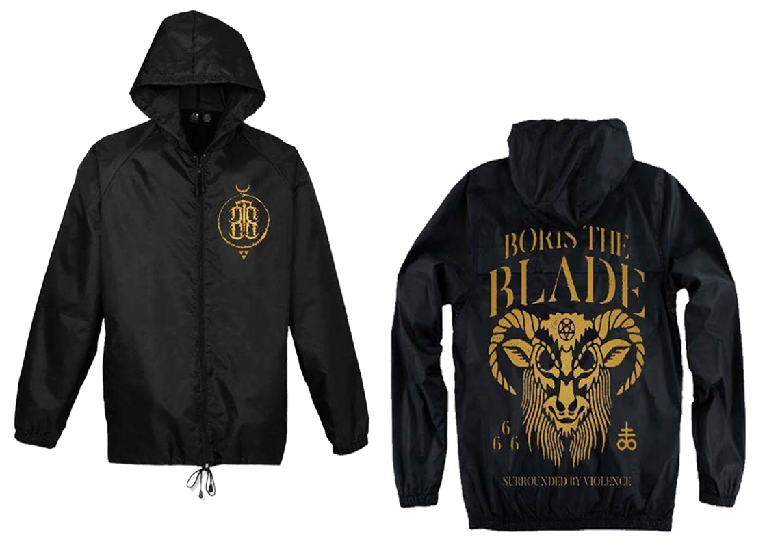 The front features the BTB symbol on the pocket, and the back features Boris The Blade in large letters at the top, with the Goat skull design underneath. There are also the lyrics "Surrounded by Violence". The windbreaker has a zip up front as well as a hood.
