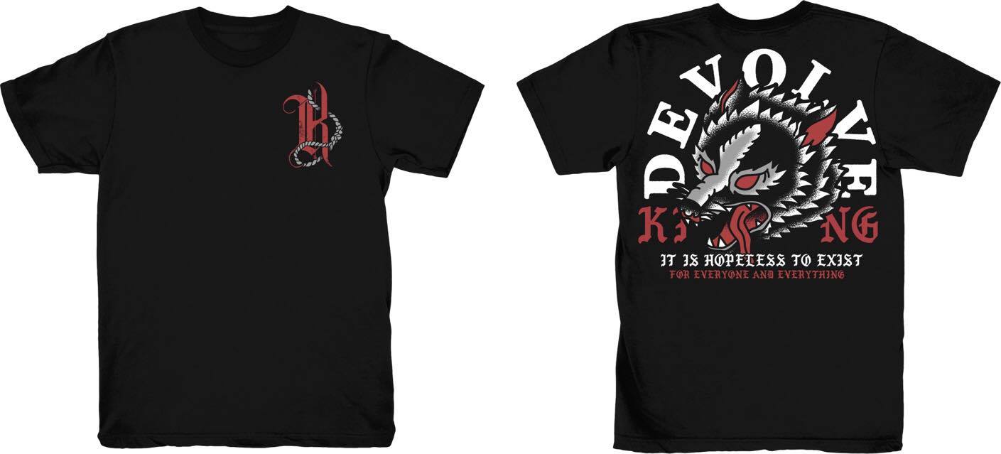 The shirt has the KING symbol in red on the front, and features a large wolf head printed on the back along with the lyrics to the song "Devolve". The shirts will be printed on black Gildan brand t-shirts.