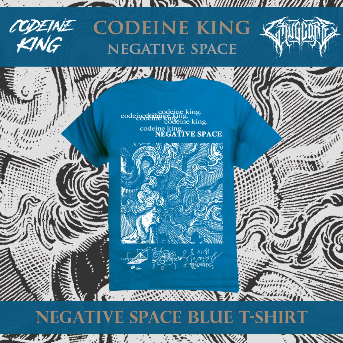 This shirt be a 1 sided-design featuring the a piece of the 'negative space' artwork along with the band logo & album name at the top. Printed on "Heather Blue" Gildan brand t-shirts.