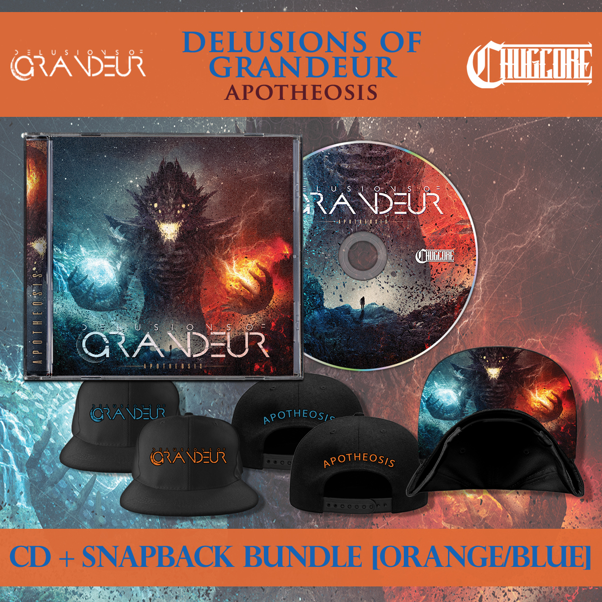Along with the re-press of the CD, we are launching a new Delusions of Grandeur merch item which is sure to be a hit. We have snapback hats, featuring a full color under-brim print of the 'Apotheosis' artwork. The snapbacks are available with either Blue or Orange embroidery.