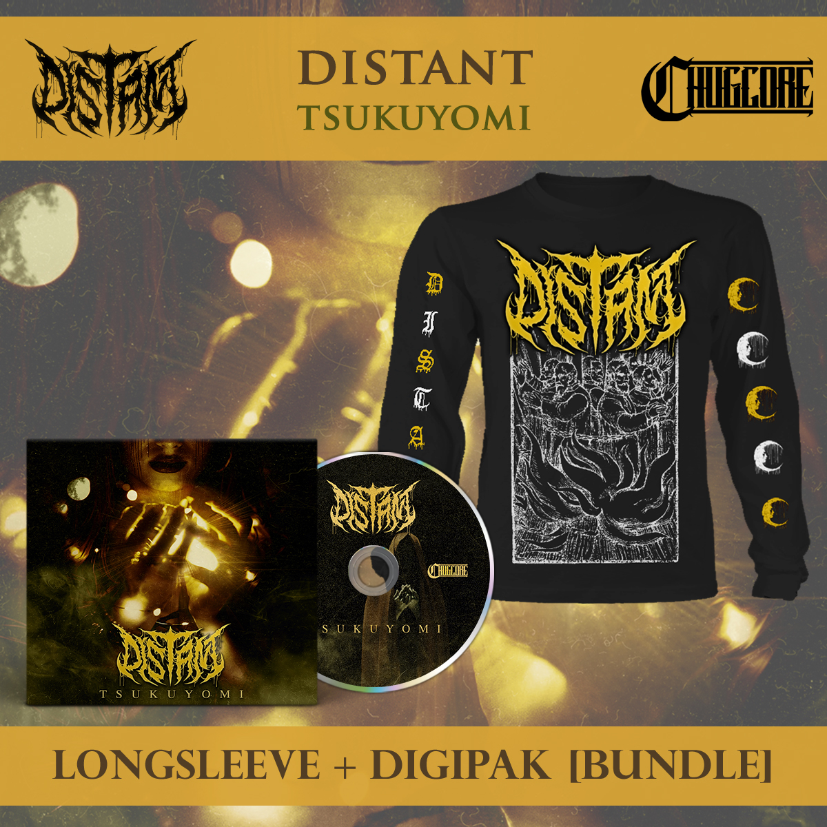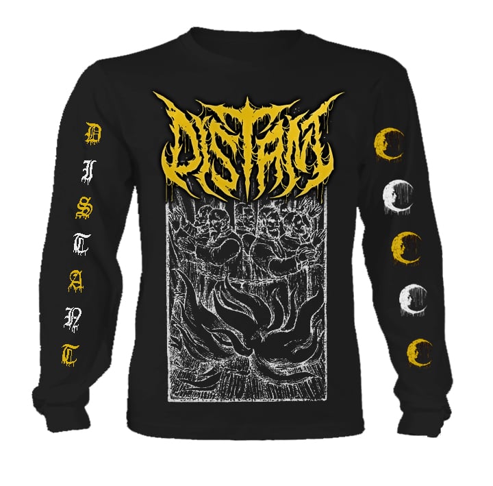 This bundle contains the 'Sacred Burning' Longsleeve and the CD. The longsleeve features the sacred burning design on the front with a large yellow Distant logo at the top. The sleeves contain an alternating Yellow/White pattern of "Distant" on one side and the Distant moon symbol on the other side, printed on a black Gildan brand longsleeve.