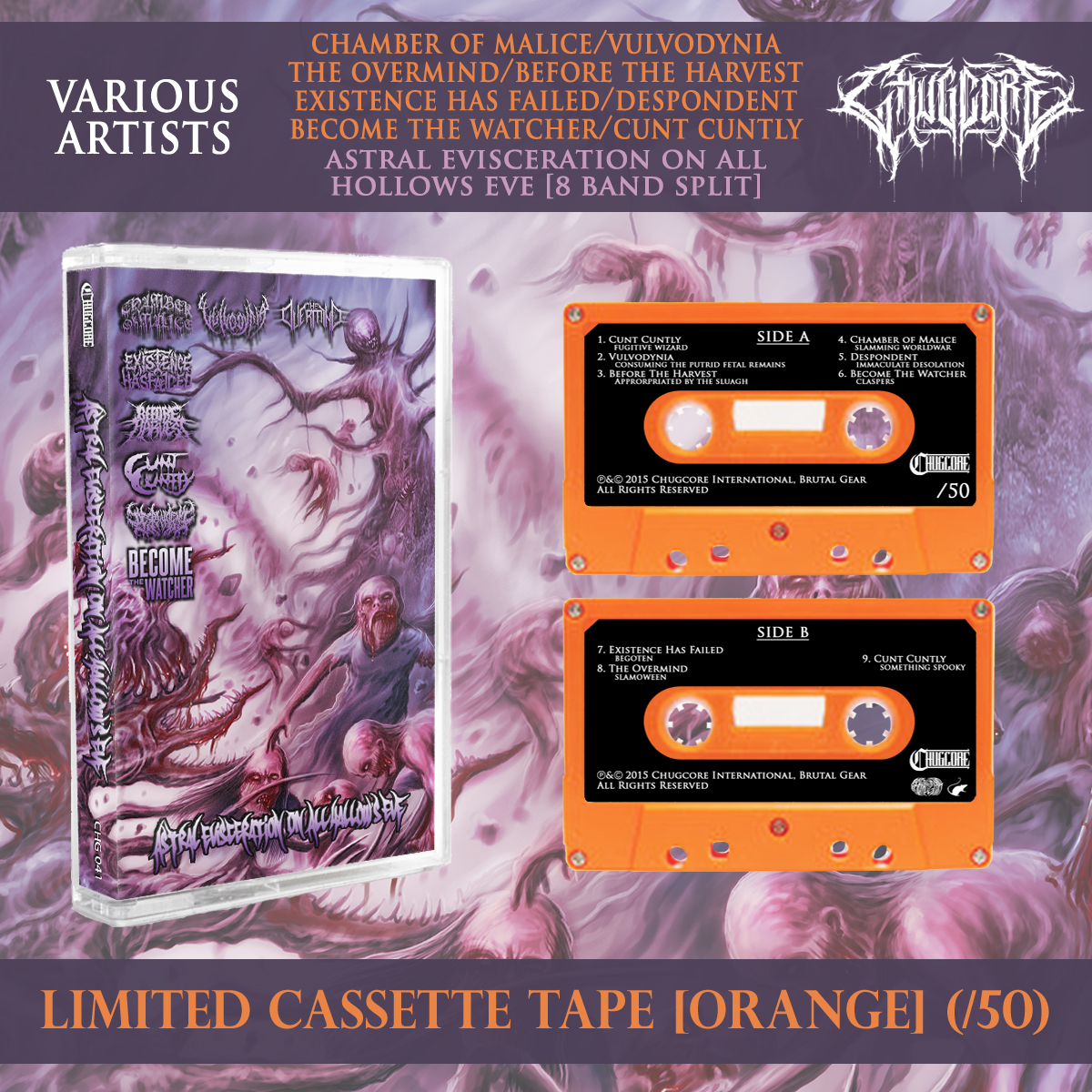 Pre-Order a copy of a very limited Chugcore pressing, our very first cassette tape, which will be the 8 band, 8 track, Halloween split, which releases digitally on Halloween 2015. This will be limited to only 50 hand-numbered tapes printed. Only hand-numbered will be available and only 50 total tapes will be made, so order while you can, cuz they wont last long!
