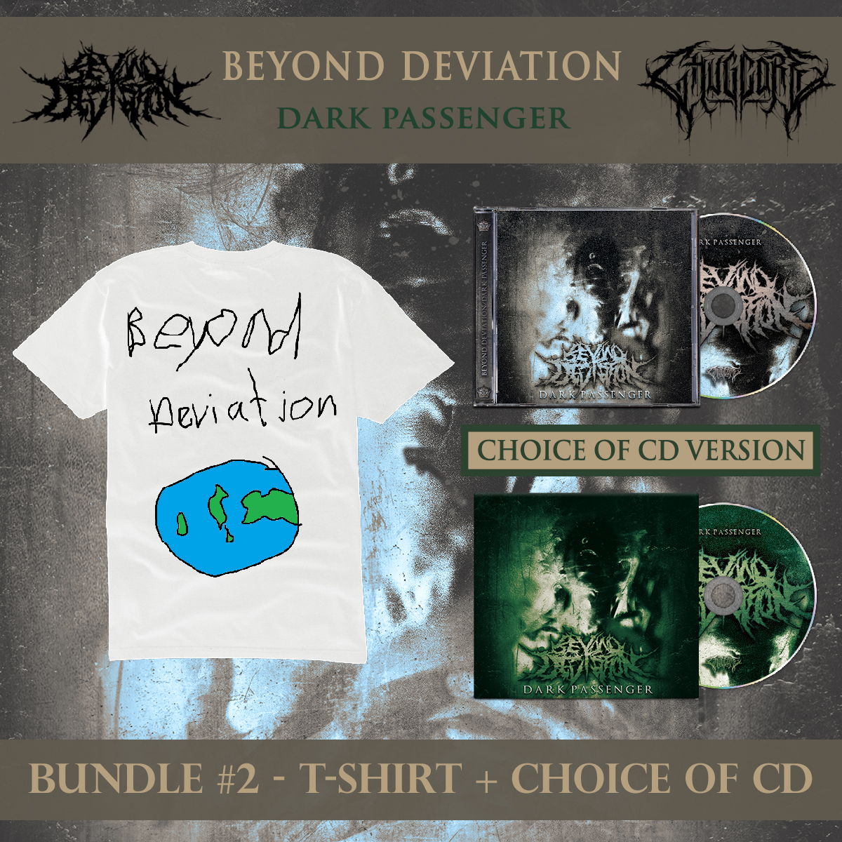 This bundle features the Beyond Deviation "Earth" design T-shirt + choice of CD version of the release. Choose between the standard jewel case version with the original cover, and the limited digipak version with the "Green" cover (limited to 100). To see what other bundles we have available please visit: www.tiny.cc/BeyondDeviationMerch