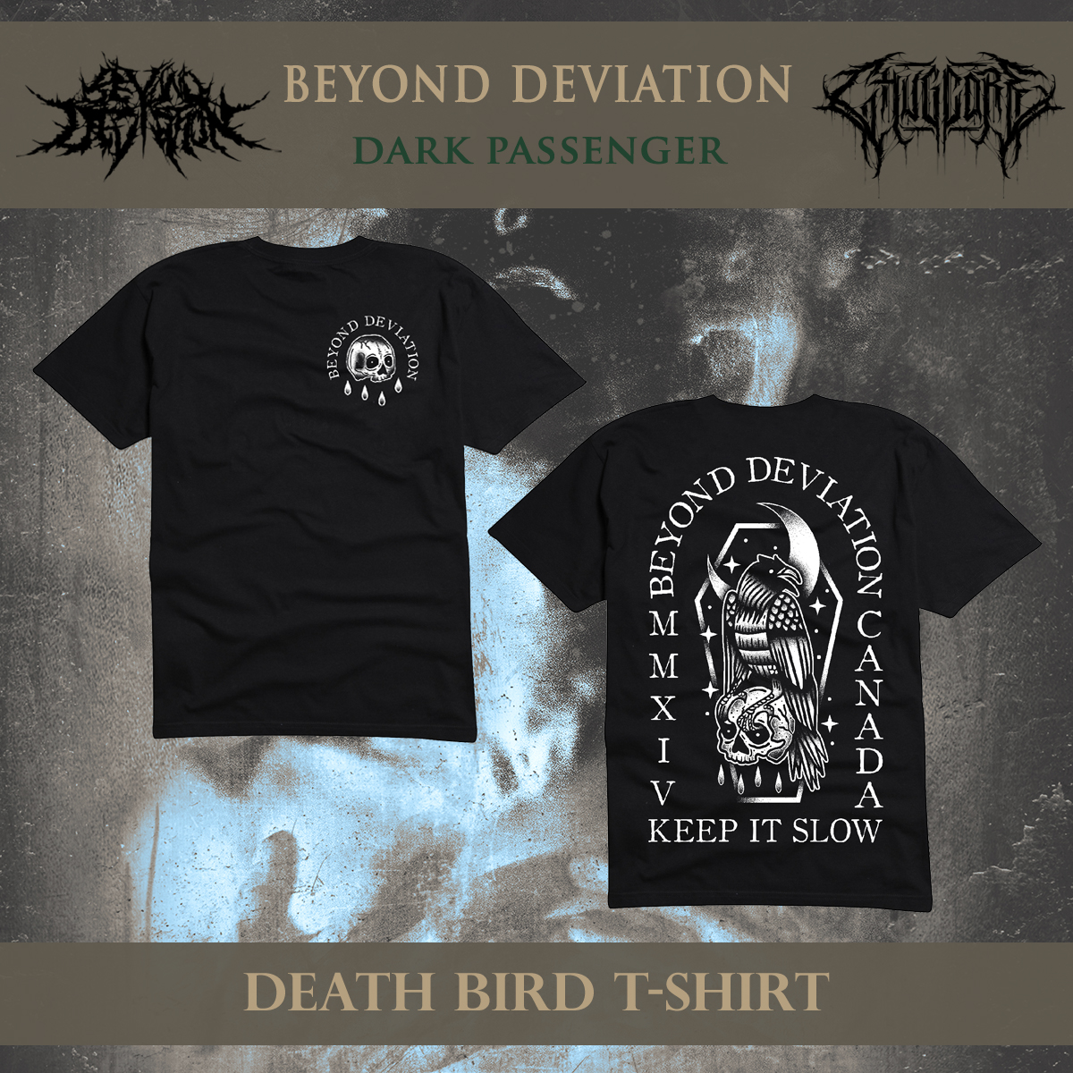 This shirt be a 2 sided-design with a pocket logo on the front of a skull, and the Death Bird on the back with the text "Keep It Slow". Printed on black Gildan brand t-shirts.