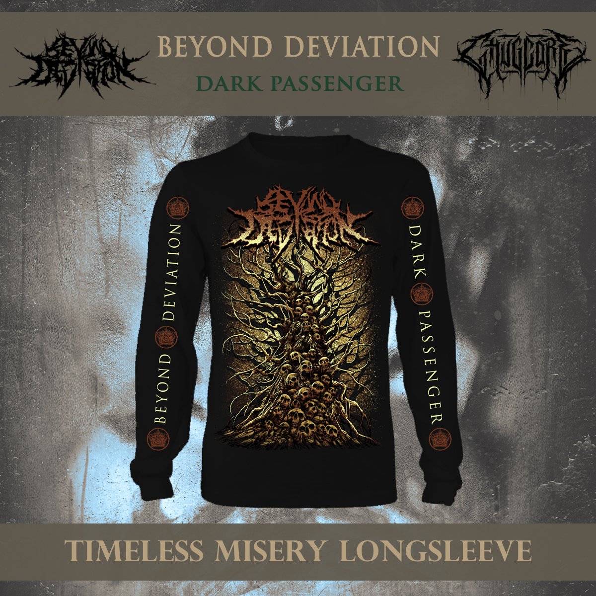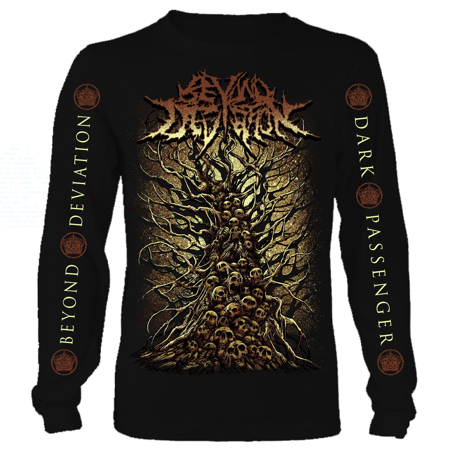 This shirt be the longsleeve design which features the "Timeless Misery" theme. There is a tree of skulls on the front in gold/tan, and the Beyond Deviation logo in brown/yellow. There is a BD Crown on the sleeves along with the text "Beyond Deviation" and "Dark Passenger".