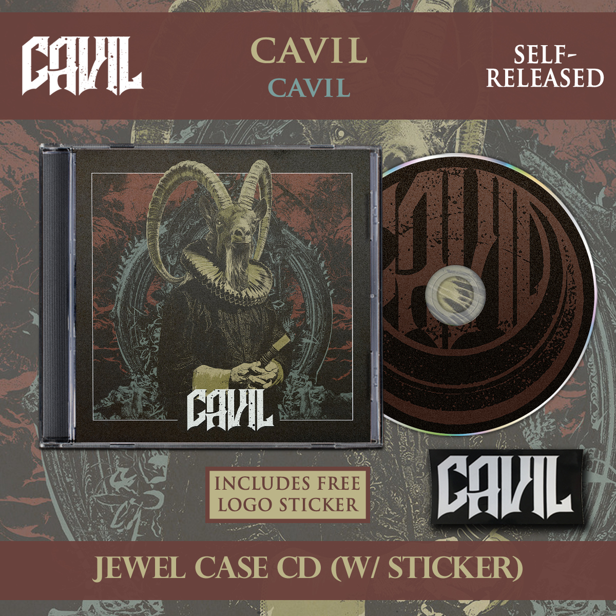 This release features 9 full length tracks printed in a factory sealed jewel case form which contains a 2 panel lyric booklet. ALL ORDERS for Cavil CDs contain a Cavil logo sticker.