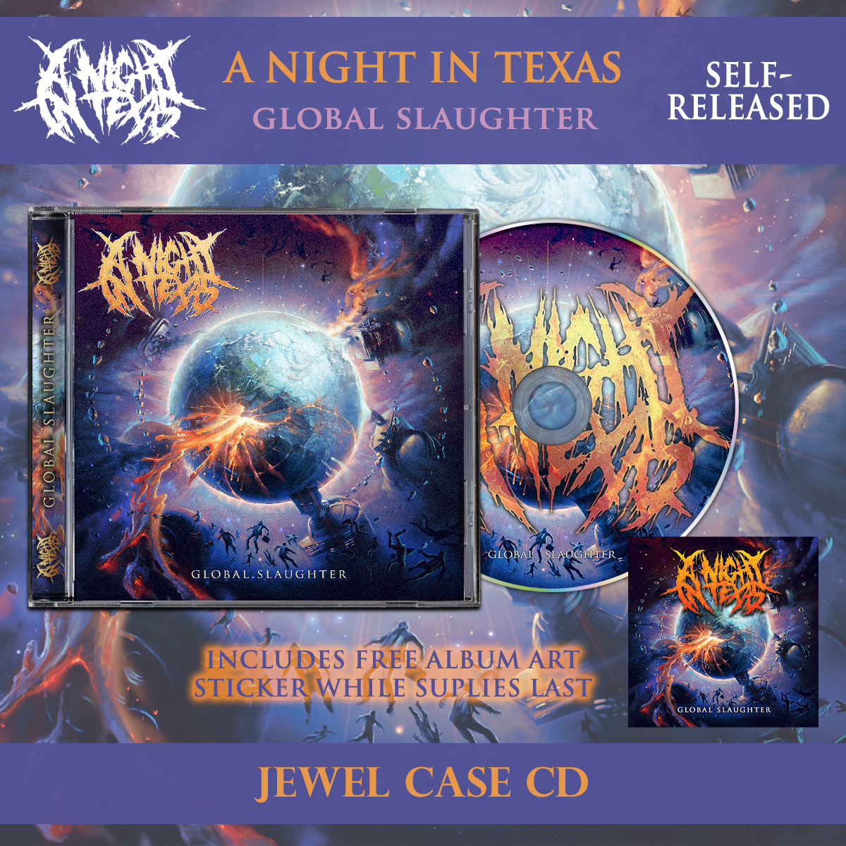 Now available and ready to ship out, a brand new venture for Chugcore, we have now in stock one of the largest releases we have ever helped put out, A Night In Texas' massive 2017 album release 'Global Slaughter'. This release was printed by Chugcore in the USA and is officially distributed by our company worldwide currently supplying A Night In Texas' store in Australia alongside Impericon in Europe.
