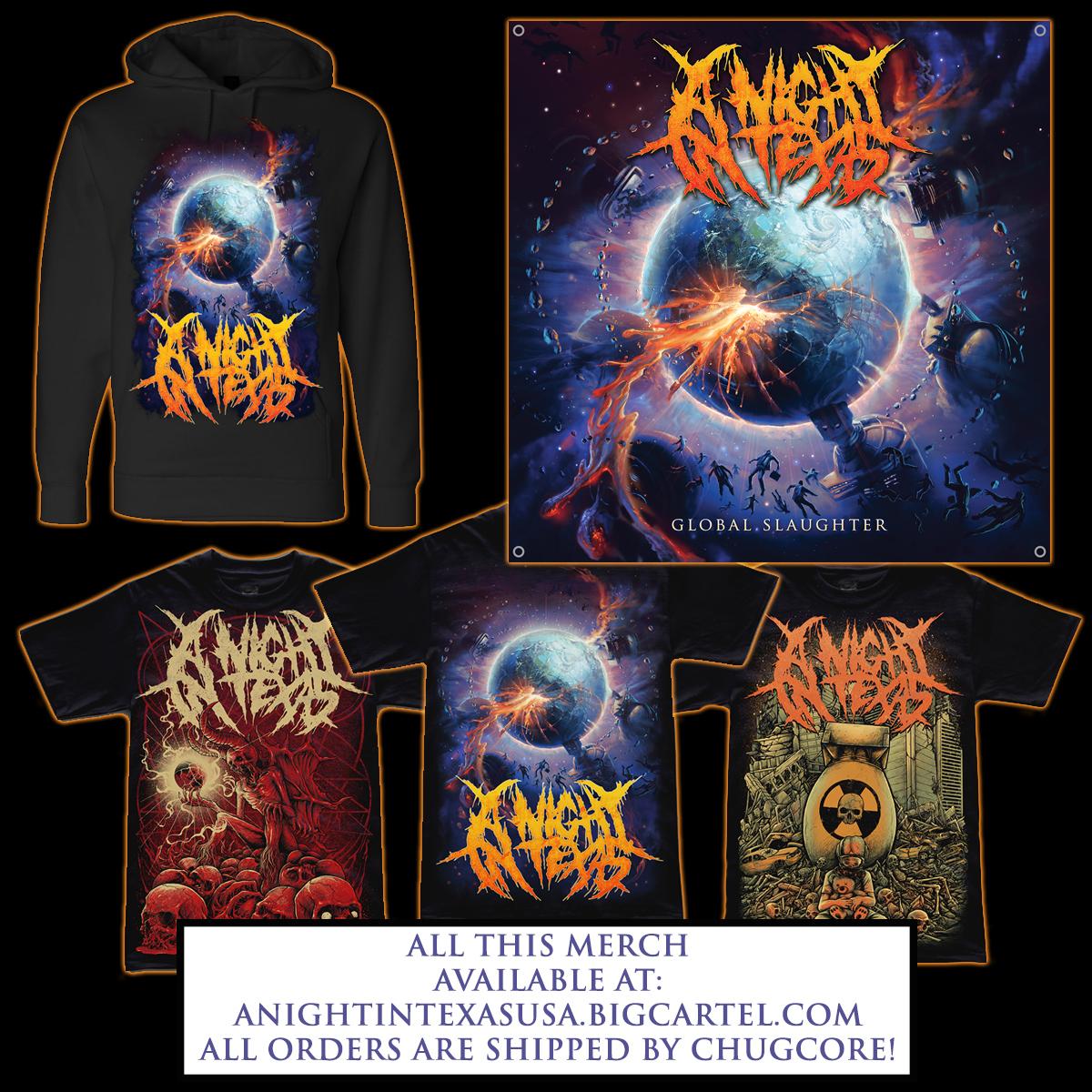We are also the official USA distributor for A Night In Texas' USA store which is hosted at http://www.anightintexasusa.bigcartel.com and all items there are printed & shipped by the Chugcore team. There are MANY pre-order options available there for 3 new T-shirt designs by the band as well as a hoodie and a wall flag so if those items interest you feel free to browse that shop, where you can feel confident that all merch items are safely shipped from the USA by Chugcore. None of the merch will be sold thru the Chugcore store at this time, only the CD.