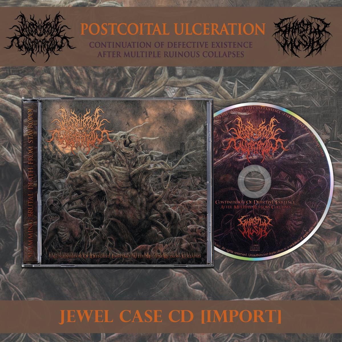 Part of our most recent pickup from Amputated Vein/Ghastly Music we have a bunch of new imported releases for all fans of heavy slam. The debut full length of South Russian, unrelenting brutality, Postcoital Ulceration. Flawless production and effortless musicianship, Postcoital Ulceration pummel the unsuspecting listener with blistering, enigmatical, uncharted levels of absolutely crushing brutality.