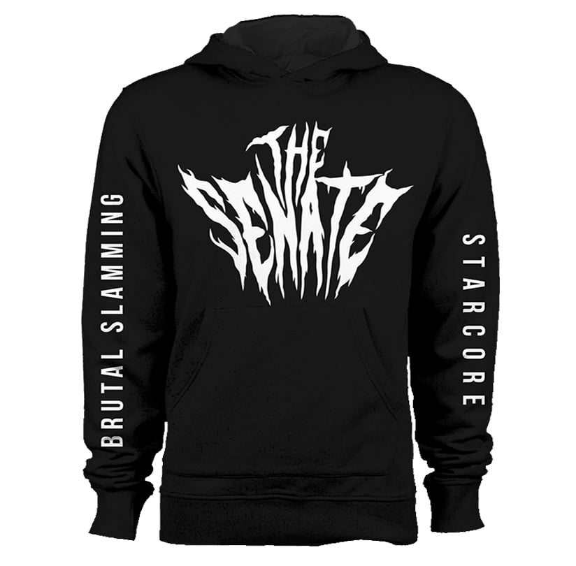 This item is the "Starcore" hoodie featuring The Senate large in white on the front, with the text "Brutal Slamming Starcore" along the sleeves. The hoodies are printed on black Gildan brand hoodies which have a front pocket.