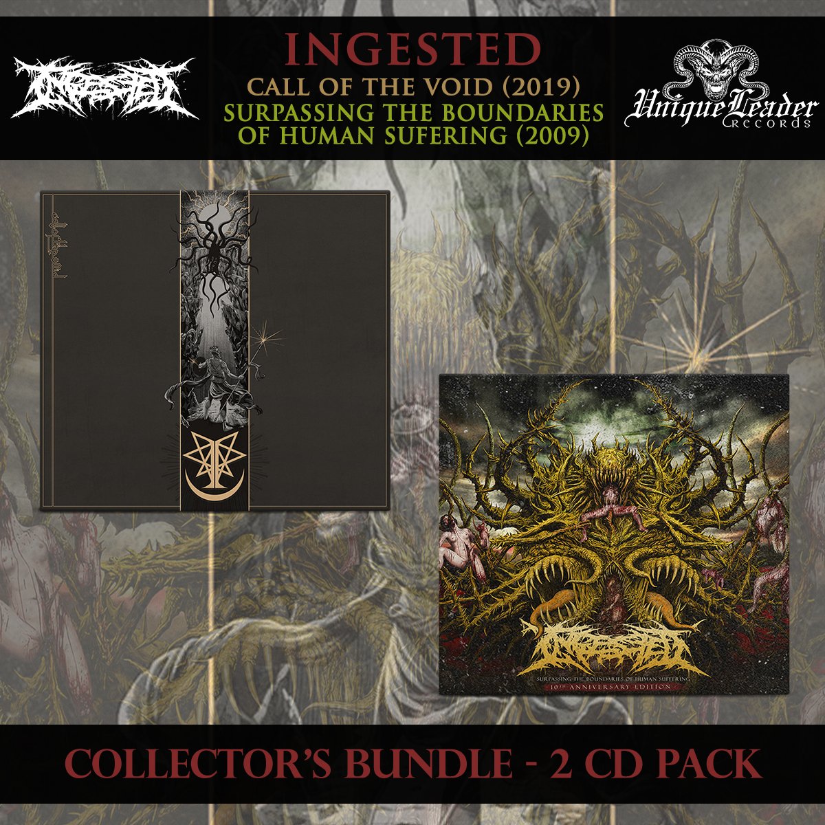 Calling all fans and collectors of the heaviest brutality, a Collectors Bundle from UK Slam Kings Ingested is now available. Featuring their newest EP along with a re-pressed re-master of the original classic 'Surpassing the Boundaries of Human Suffering'. Both CDs are in digipak format.