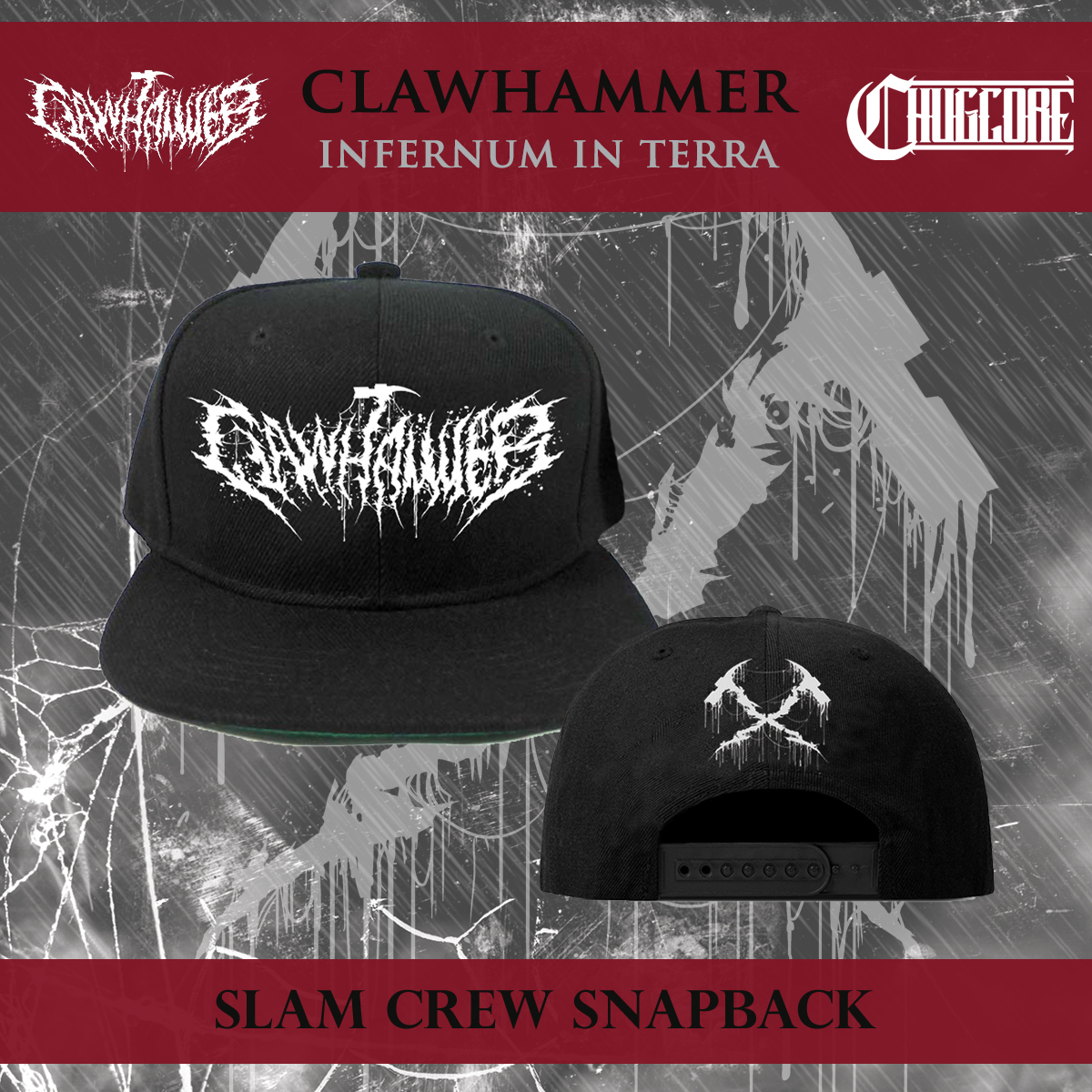 We also have 2 exclusive merch items for Clawhammer available for North American distribution. We have the Champion brand hammer mosh shorts and the Slam Crew snapback.
