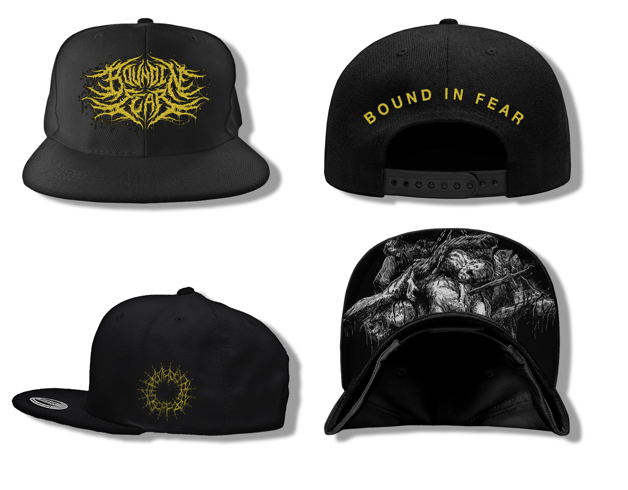 The snapbacks will be printed with a full color under the brim print featuring the album artwork. Includes the BIF logo on the front, emblem on the side and "Bound in Fear" text on the back. This is the "Gold" variant of the snapback which includes yellow/gold color embroidery throughout the design.