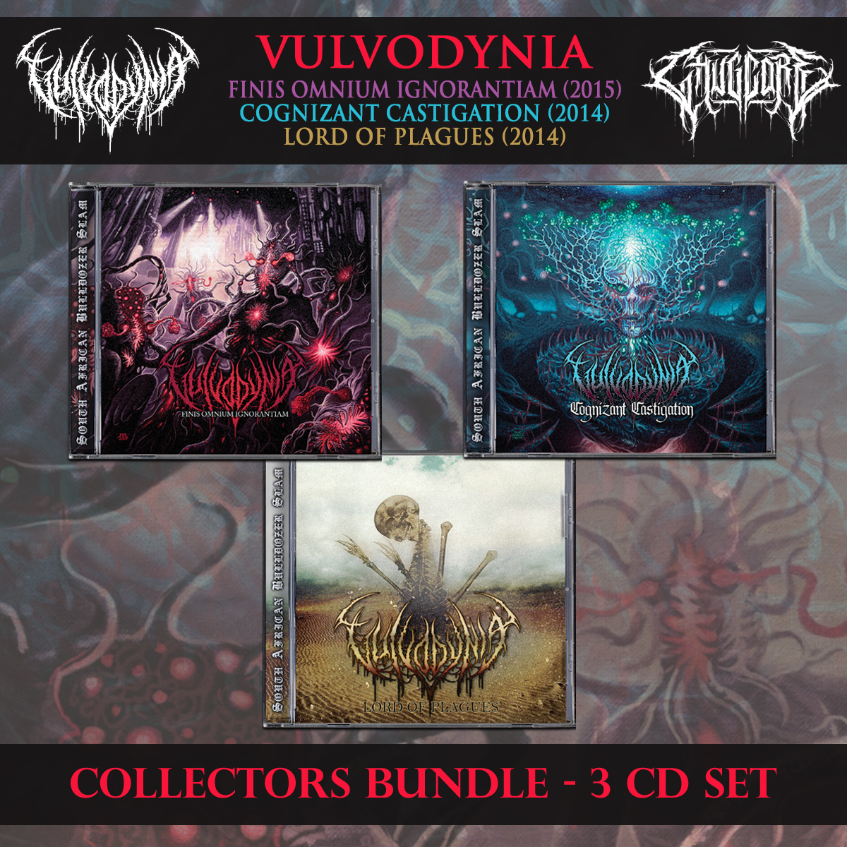 Calling all fans and collectors of the heaviest brutal death metal. A collector's bundle of Vulvodynia CDs is now available featuring their original 3 classic releases. This includes ALL of their albums besides their 2 new full length records & EP. All 3 CDs are printed in Jewel Case format and include Lyric Booklets. 'Lord of Plagues' includes 2 special bonus tracks - the Halloween and Christmas Cover songs.