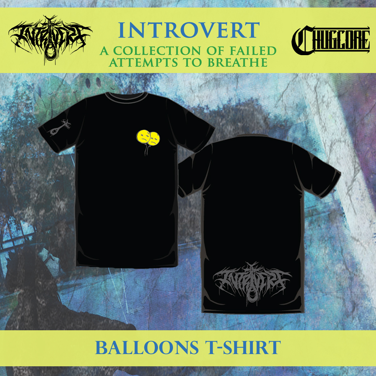 This package contains the T-Shirt only. The shirt will be a black gildan brand t-shirt with a yellow Balloons design print on it. The front includes the balloons design as well as the Introvert noose symbol on one sleeve. The back features the Introvert new logo on the bottom of the shirt. There will only be a limited amount of this shirt design printed. After the pre-order period, limited extra stock will be made, once that's gone, it's gone for good!
