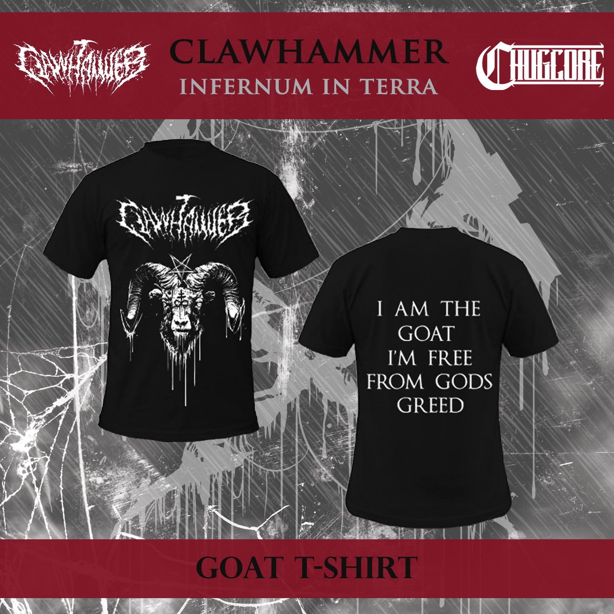 This item is for the Clawhammer Goat T-Shirt design only. These will be printed on black gildan brand t-shirts. The shirt features the evil goat image on the front, and the lyrics "I Am The Goat I'm Free From God's Greed" on the back.