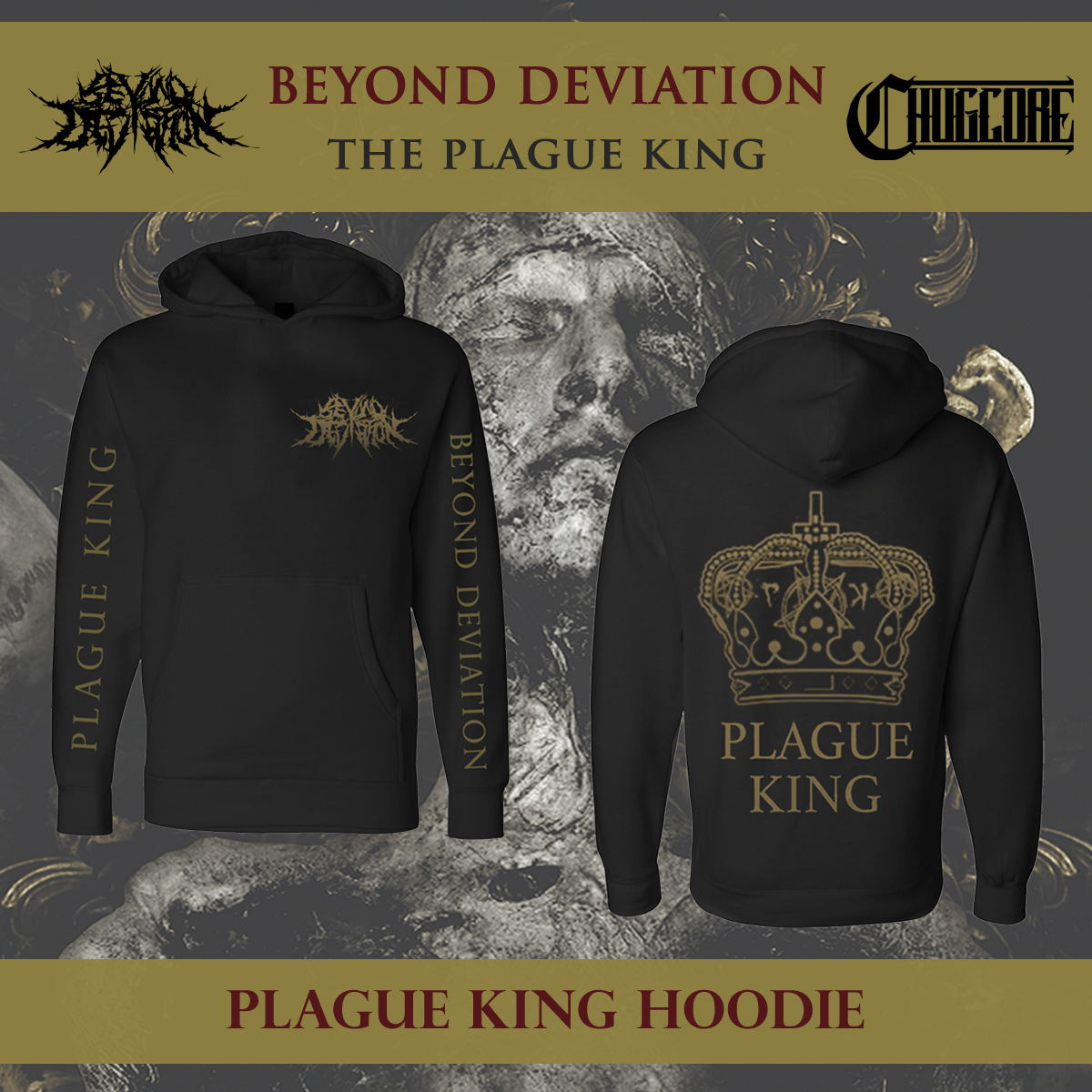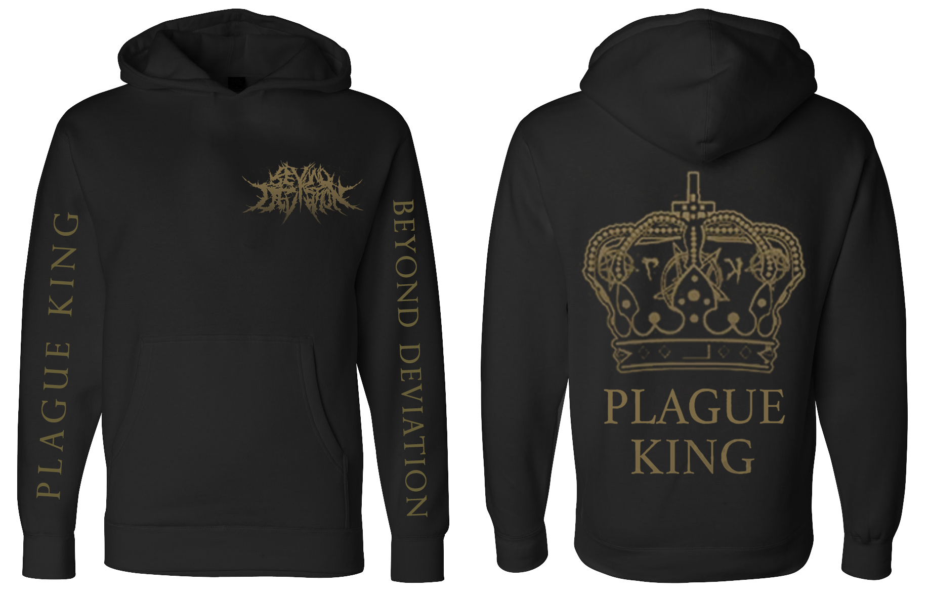 This hoodie will be a two-sided printed design of a gold "Beyond Deviation" logo on the front with "Plague King" and "Beyond Deviation" printed in gold on each sleeve. A gold crown design along with the text "Plague King" will also be printed on the back of each hoodie.