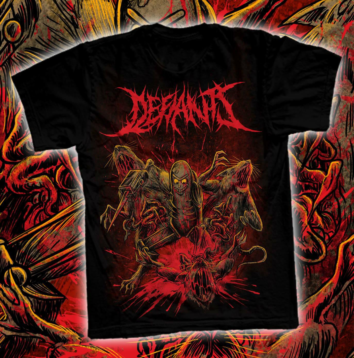 This shirt will be a one-sided printed design of a take on the "Pickle Rick" scene from the TV cartoon "Rick and Morty". The front features Pickle Rick crushing rats with a Red Defiants logo on the front. Printed on black Gildan brand t-shirts.