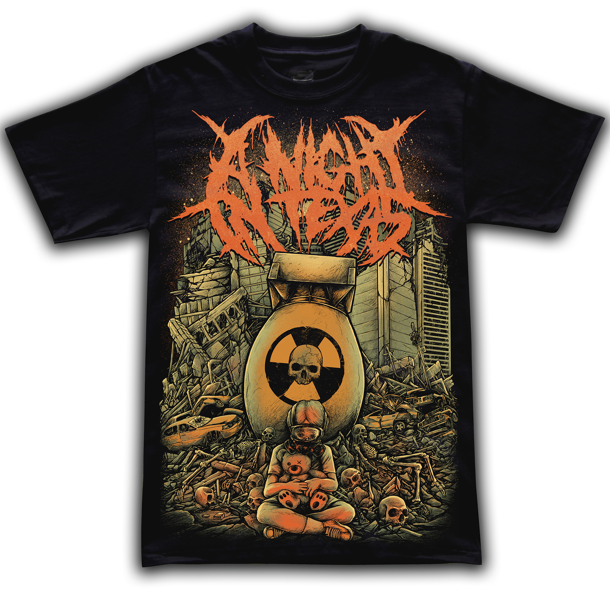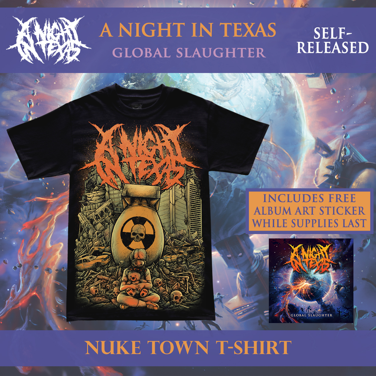 This shirt will be a 1-sided design featuring the "Nuke Town" design which features an orange/green city destroyed by a bomb with an orange band logo. The shirts are printed on Gildan brand t-shirts. Includes free album art sticker while supplies last.