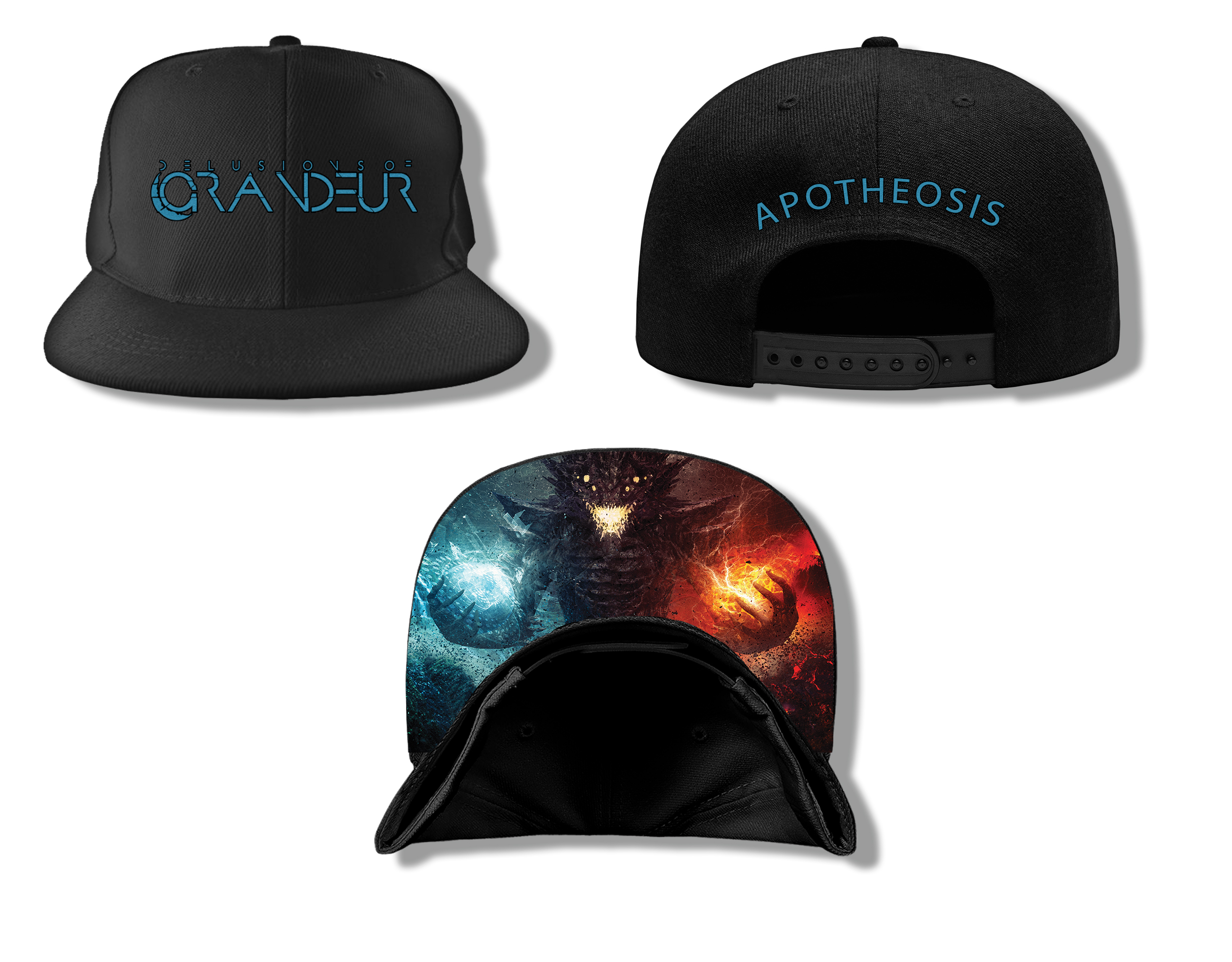 The snapbacks will be printed on a black standard stock hat, with a full color under the brim print featuring the album artwork. The Delusions of Grandeur logo is featured on the front, along with the text Apotheosis on the back.