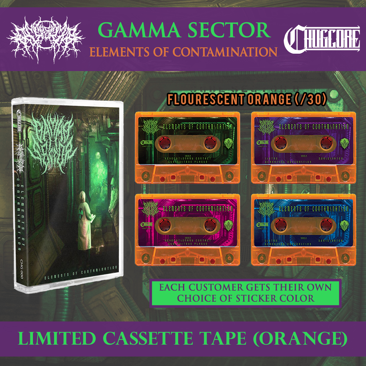 We welcome the newest addition to the Chugcore store, we have an ultra customized cassette tape release for one of our popular releases, Gamma Sector. Presenting their 2016 debut EP "Elements of Contamination" as a limited cassette tape pressing, in fluorescent orange and lime green, these glow under a black-light, and are limited to /30 each and hand-numbered.