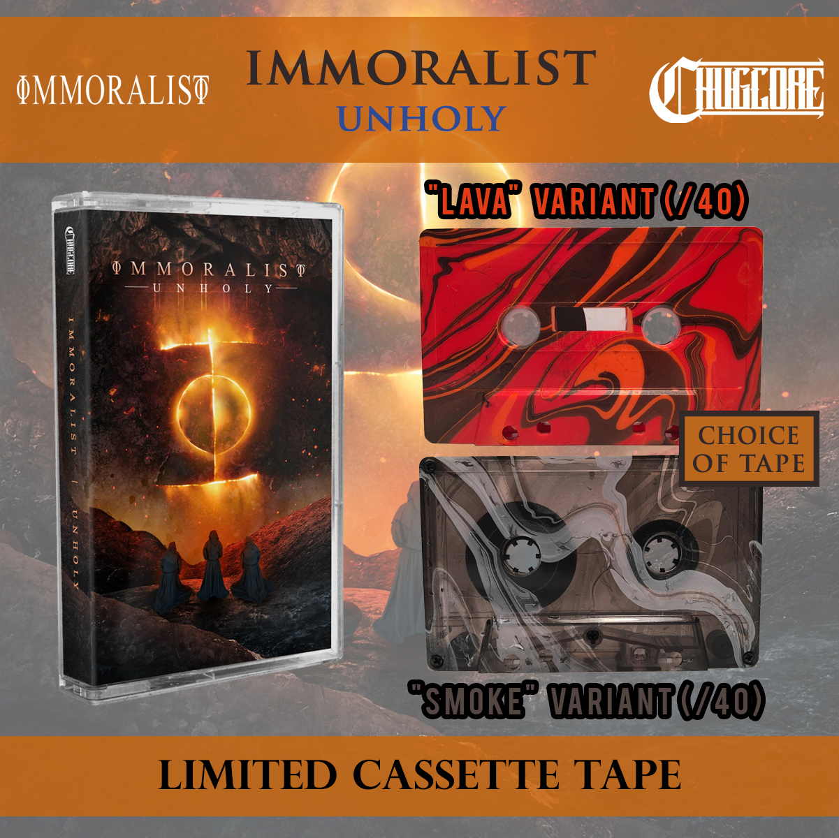Immoralist just dropped their monumental album "Unholy" last week and we are now bringing you some exclusive merch through Chugcore which includes a limited run of Cassette Tapes as well as a large print Wall Flag.