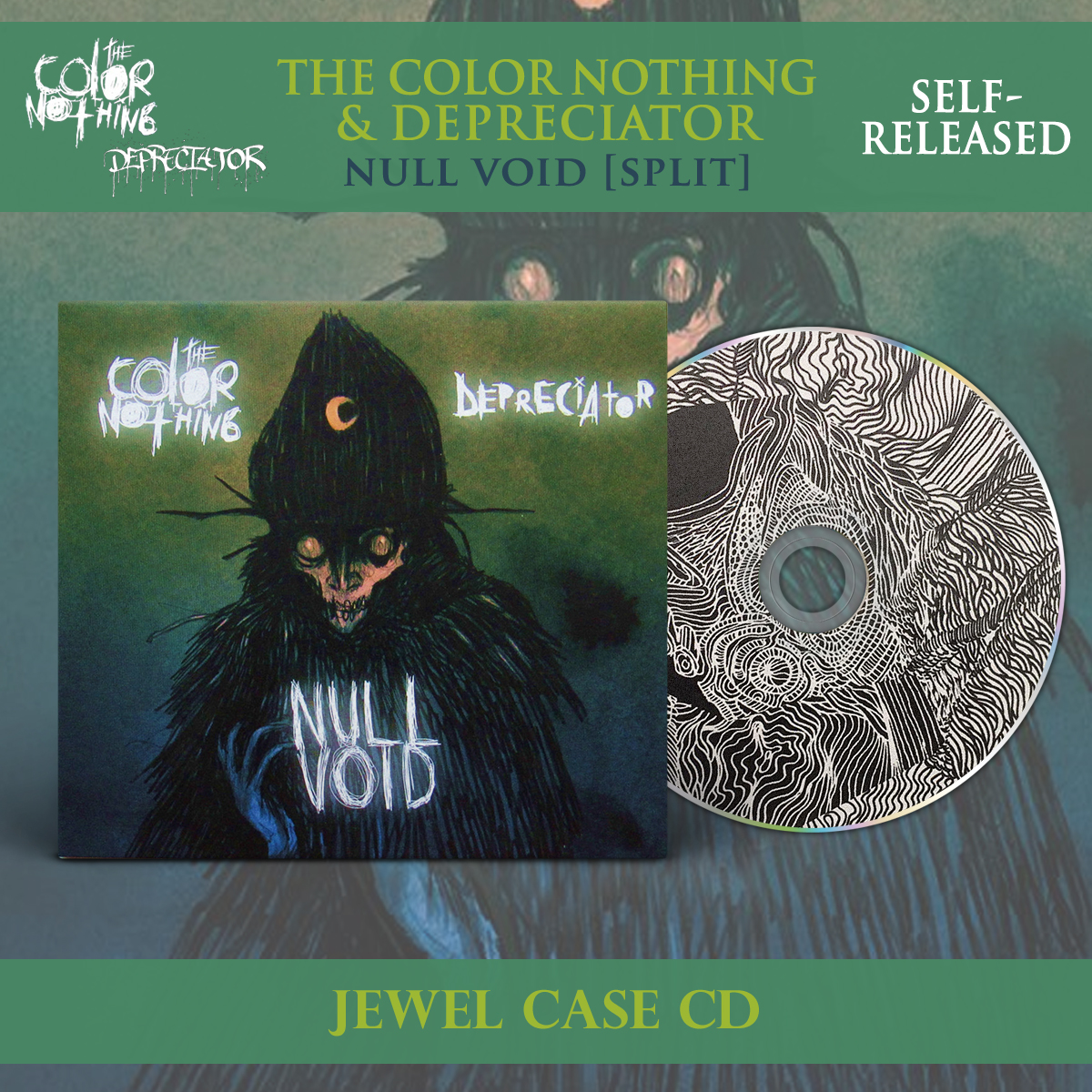 This release features 8 full length tracks with the first 4 tracks (Null) by The Color Nothing and the next 4 tracks (Void) by Depreciator. It is printed in a factory sealed digipak form.