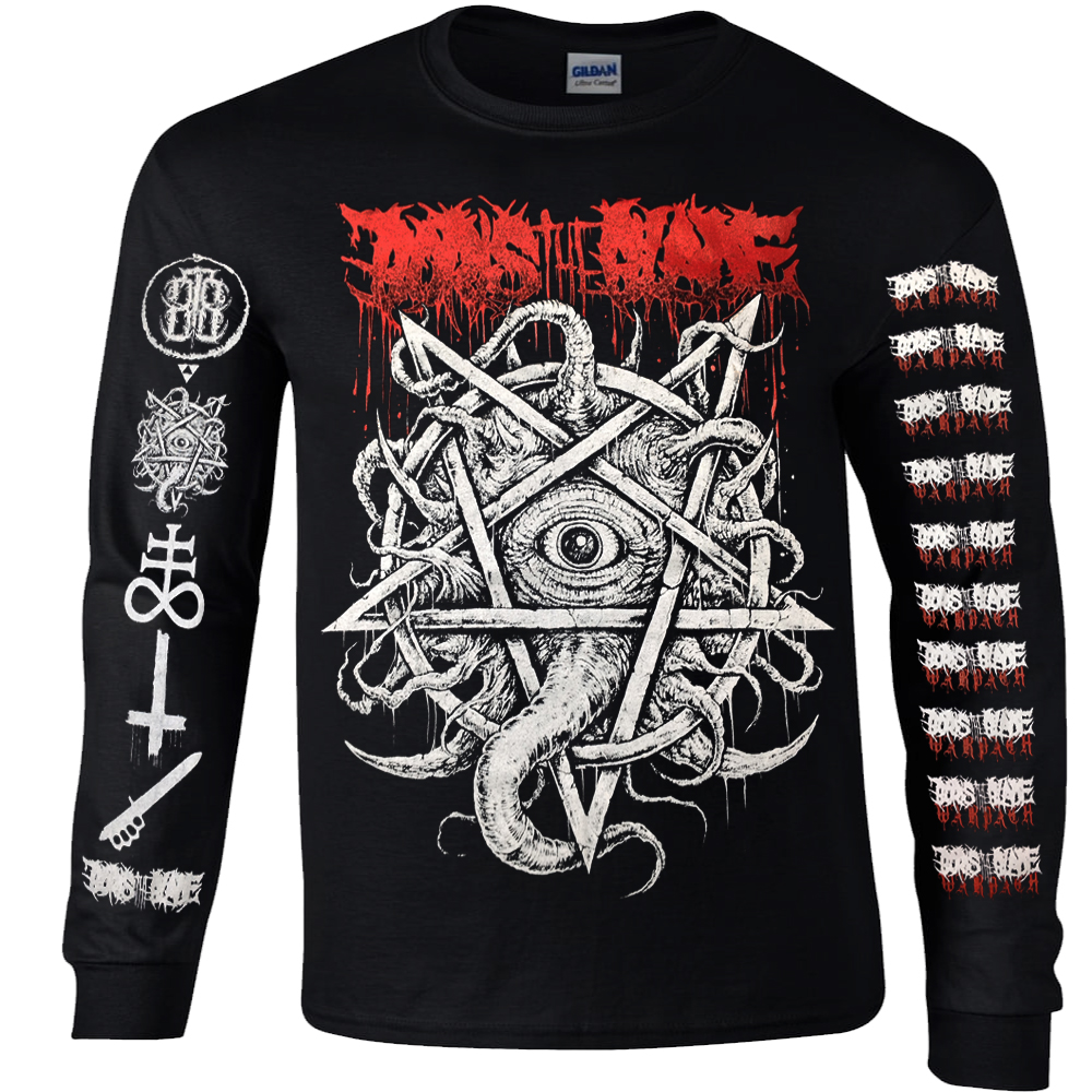 On sale now, we have an awesome new merch design from the legendary Australian Deathcore brutes, Boris The Blade. Here we have a black long sleeve shirt with a white and red front print. The sleeves feature a print on both sides as well which makes for a large amount of print coverage.