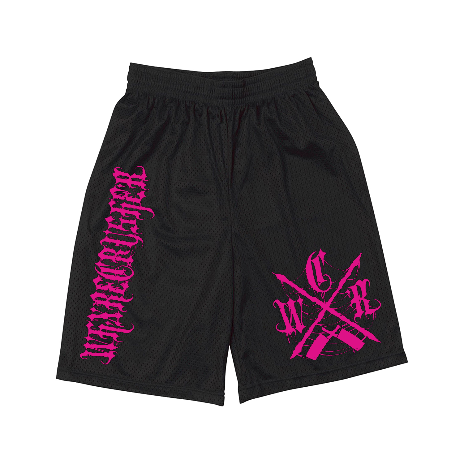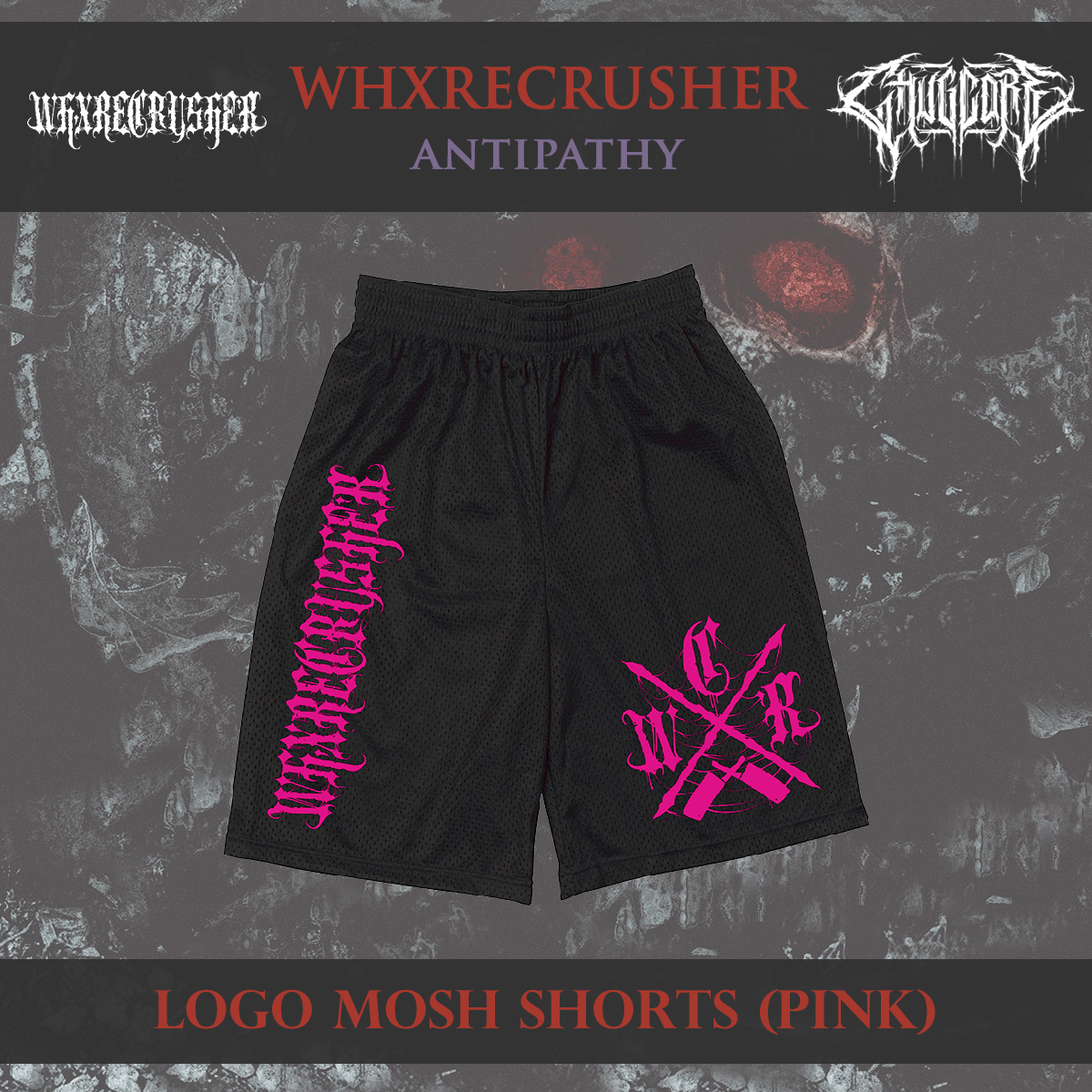 These will be black mesh gym shorts with hot pink print. The left short leg contains the WxC emblem and the right leg contains the Whxrecrusher logo.