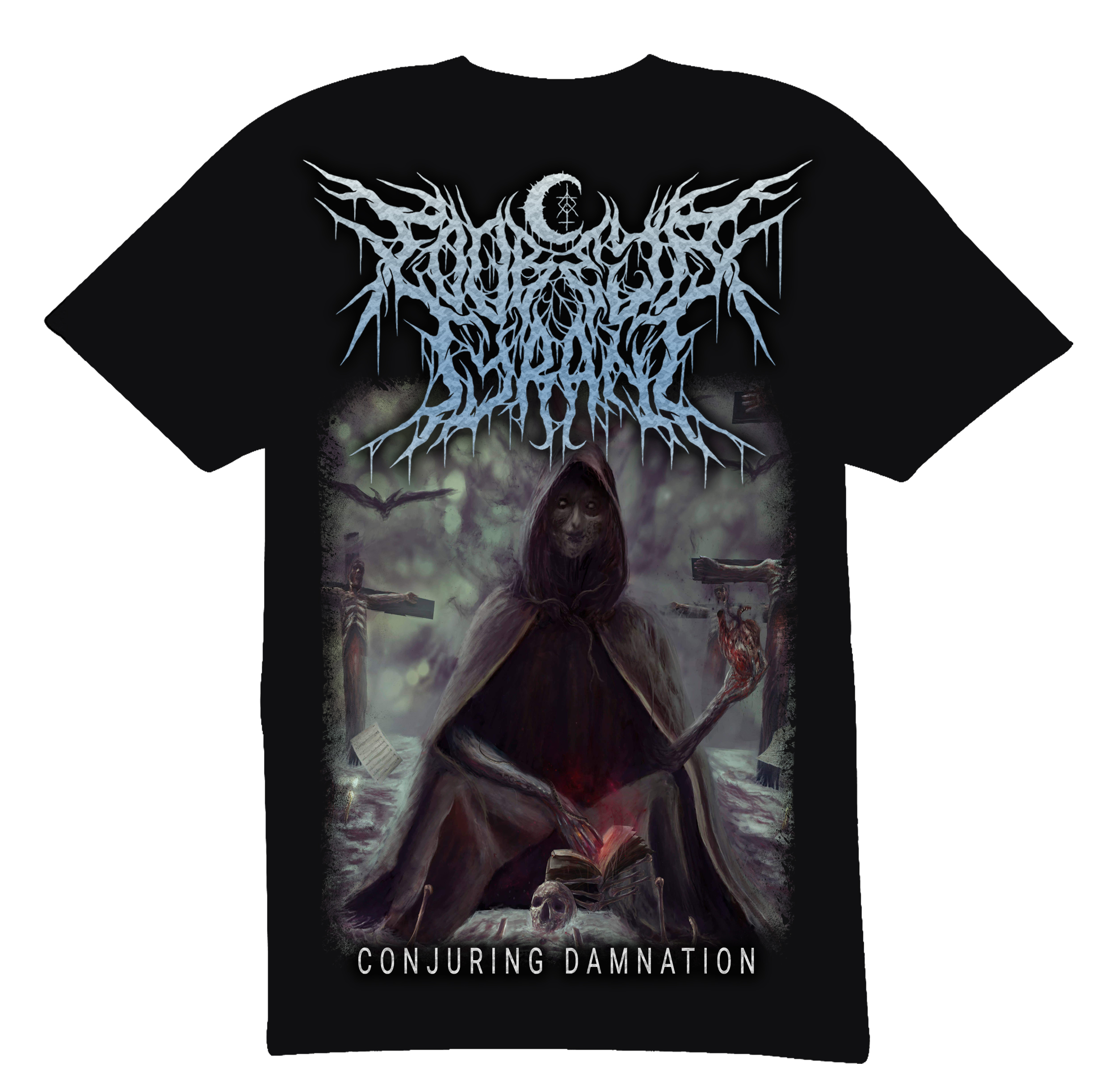 This bundle contains both the CD and the T-shirt for 'Conjuring Damnation'. The shirt be a 1 sided-design featuring the 'Conjuring Damnation' artwork and Blue/White band logo. Printed on black Gildan brand t-shirts.