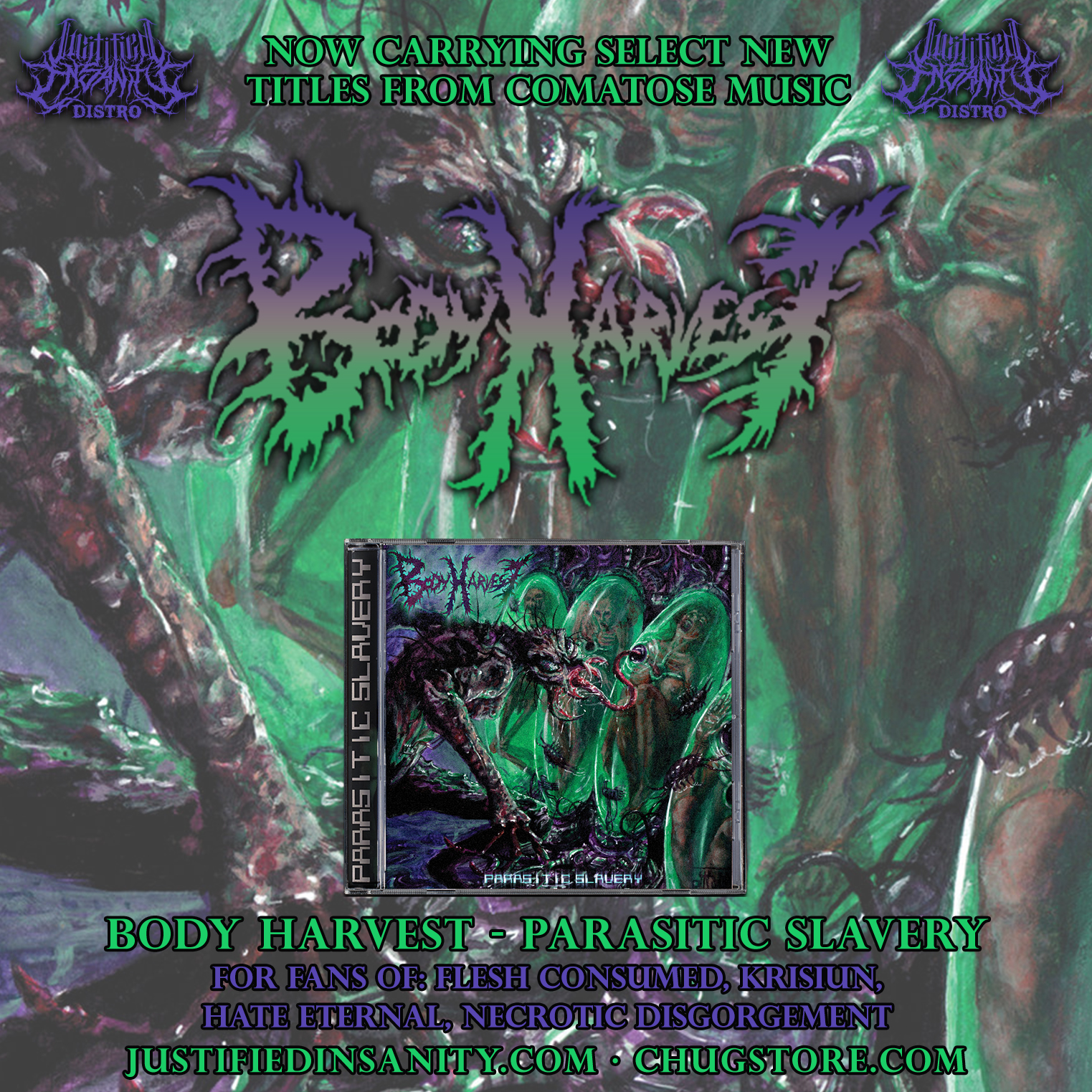 Body Harvest release their second album a stunning display of superb song writing with a classic death metal sensibility and skin flaying velocity. Delivered with fearsome drive and focus, this album is one cataclysmic, explosive collection of incredible death metal. ‘Parasitic Slavery’ annihilates with an imperious magnificence born of absolute self belief.